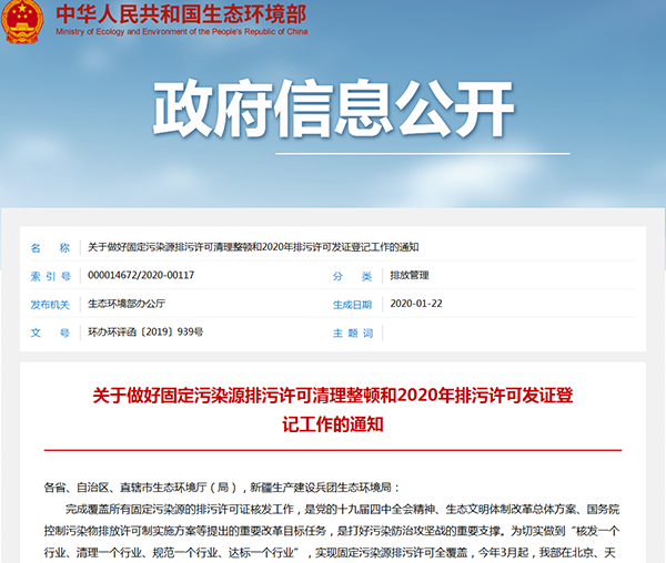 2020年1月22日,生態(tài)環(huán)境部發(fā)布了《關于做好固定污染源排污許可清理整頓和2020年排污許可發(fā)證登記工作的通知》,詳情如下: