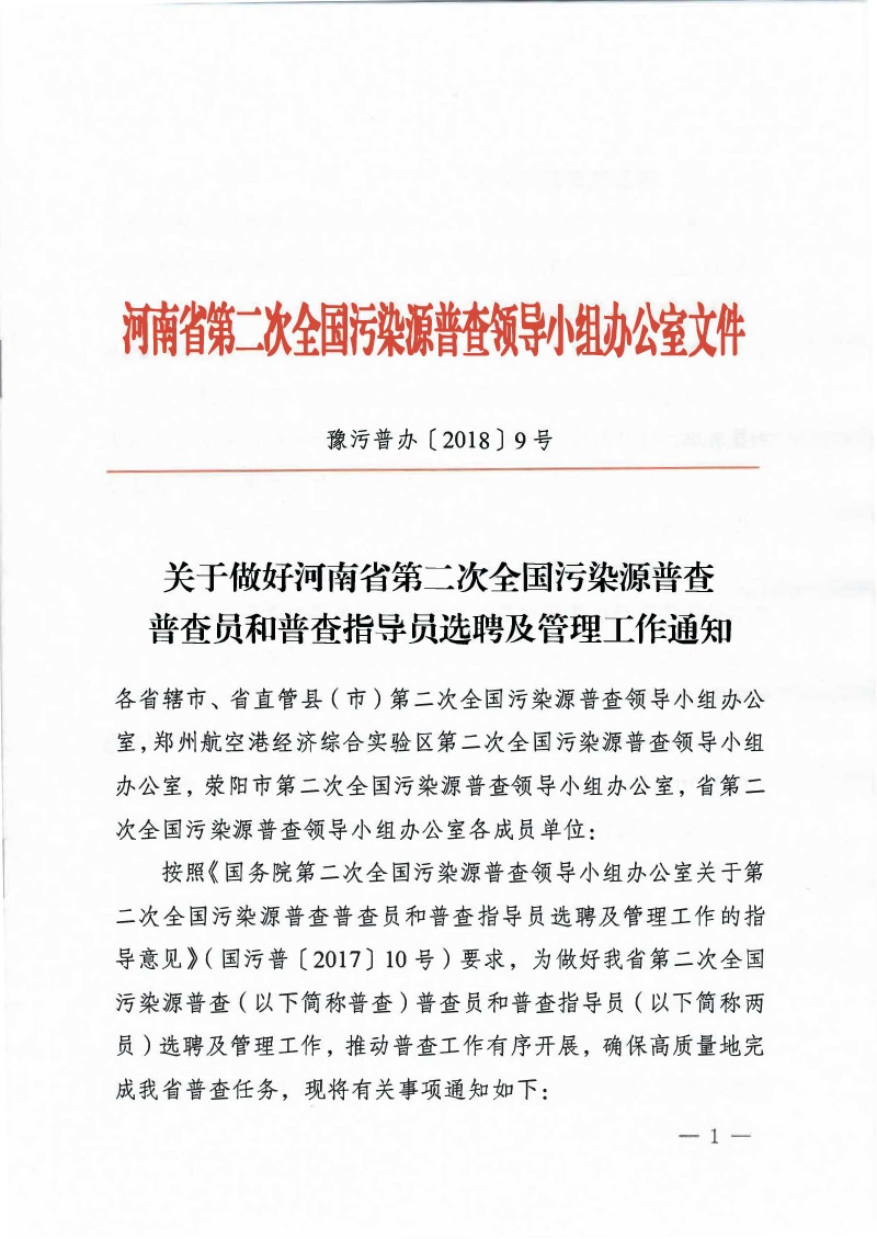 豫污普辦【2018】9號關(guān)于做好河南省普查員和普查指導(dǎo)員選聘及管理工作通知