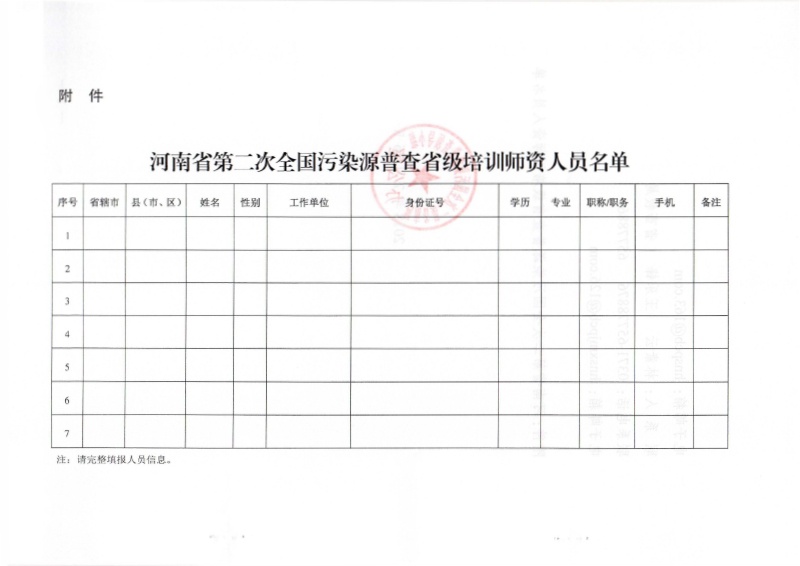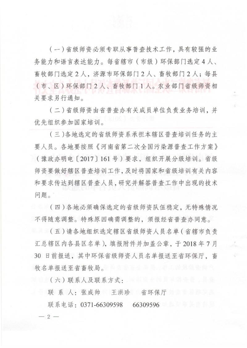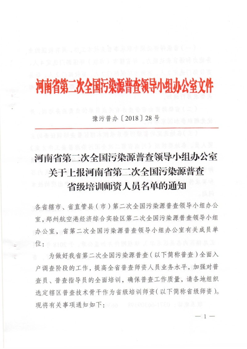 豫污普辦【2018】28號)關(guān)于上報(bào)河南省第二次全國污染源普查省級 培訓(xùn)師資人員名單的通知